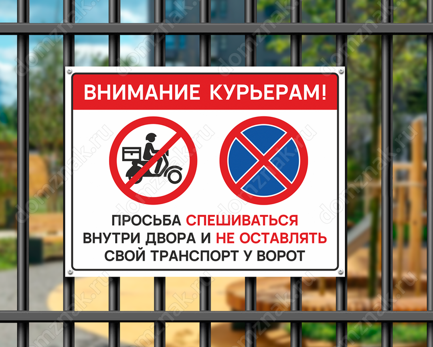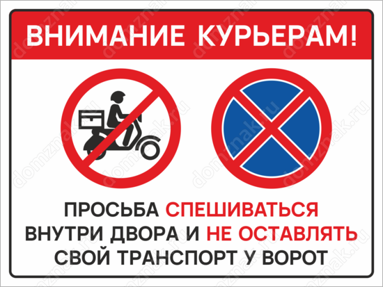 Табличка «Внимание курьерам! Просьба спешиваться внутри двора и не оставлять свой транспорт у ворот»